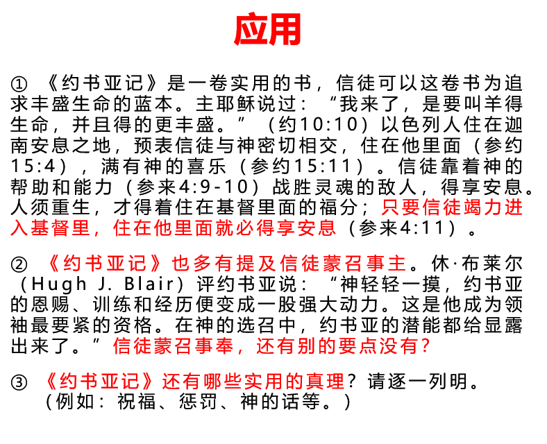 神是永不改变的神,祂借着本书向最初的读者所要发表的信息,也是向将来所有陷入同样难处的百姓所发表的。信实守约的神过去如何带领以色列人进入迦南,今天也会照样带领我们进入安息:“若是约书亚已叫他们享了安息,后来神就不再提别的日子了。这样看来,必另有一安息日的安息为神的子民存留“(来4:8-9)。