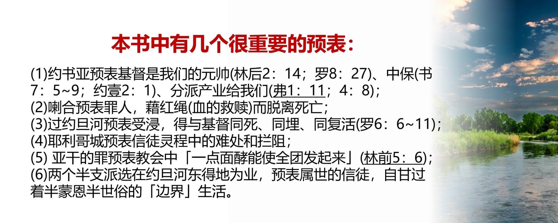 《约书亚记》也被称为先知书,我们从先知的角度来了解作者向最初的读者所要发表的信息,进而认识神借着这卷书对今天的读者所说的话。